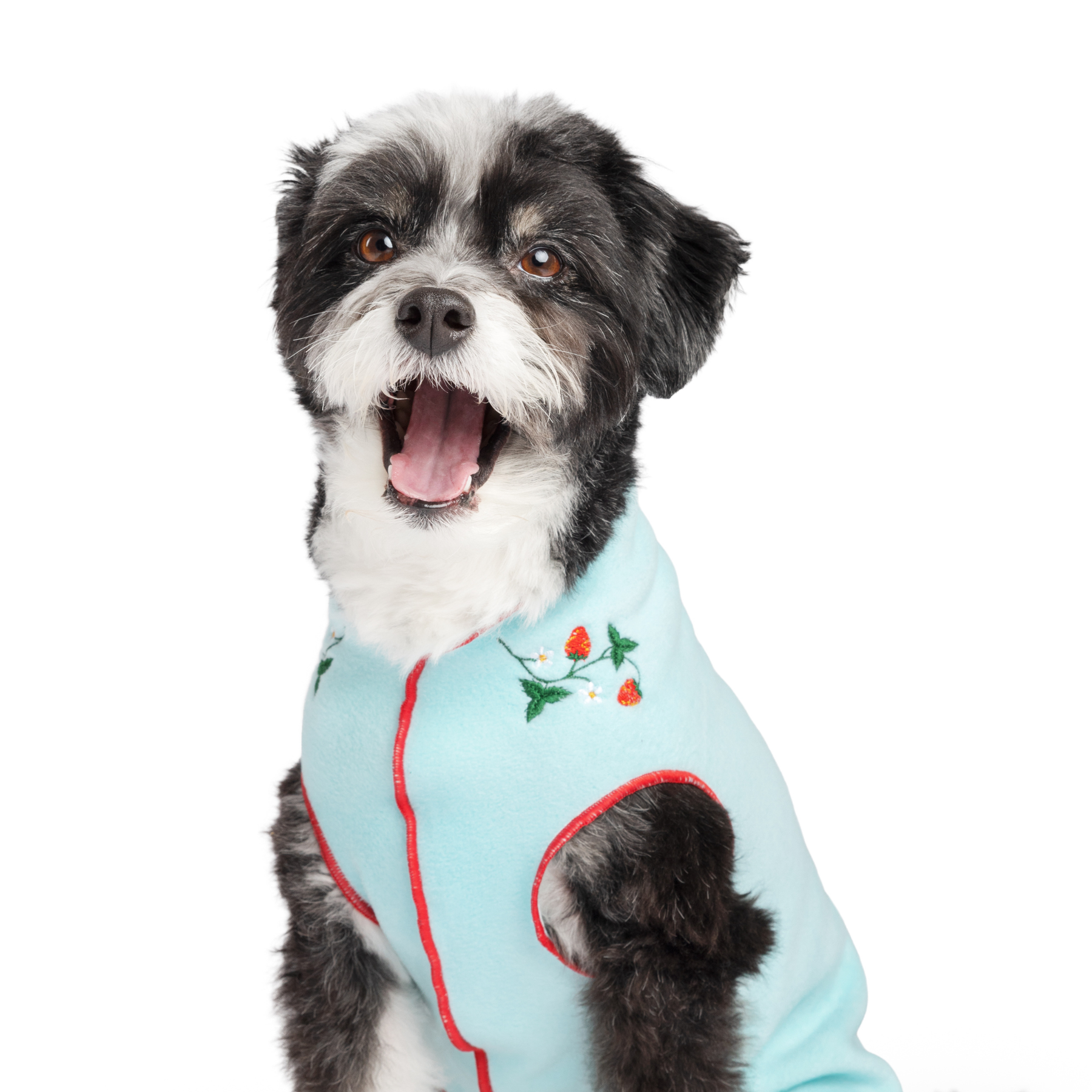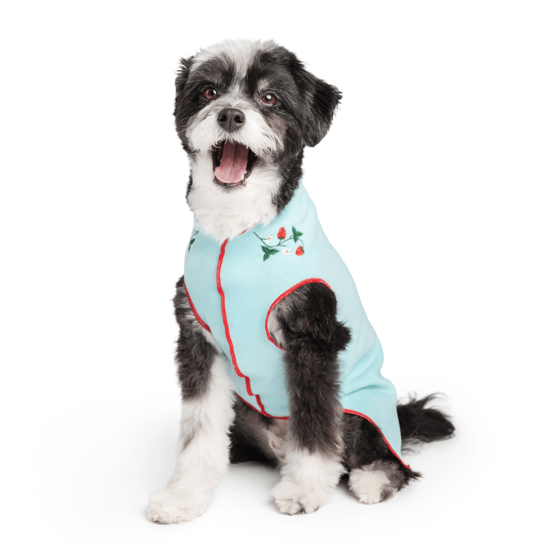 Our beloved Stretch Fleece is sweeter than ever! We took a classic Stretch Fleece in Robin Egg Blue, stitched with Red thread and then embroidered some sweet, delicate strawberry vines on the collar.